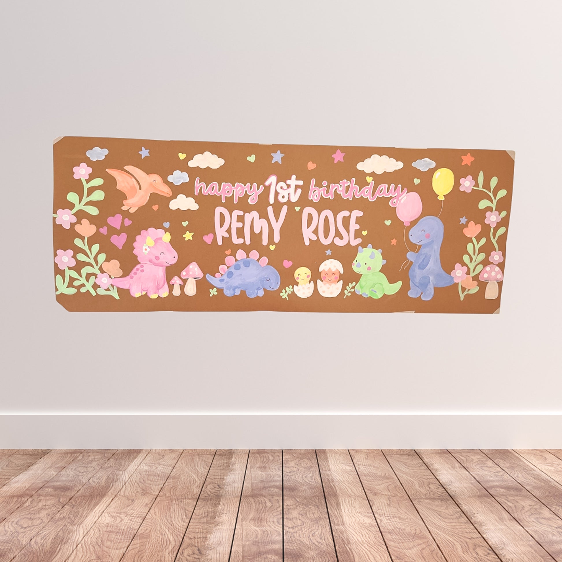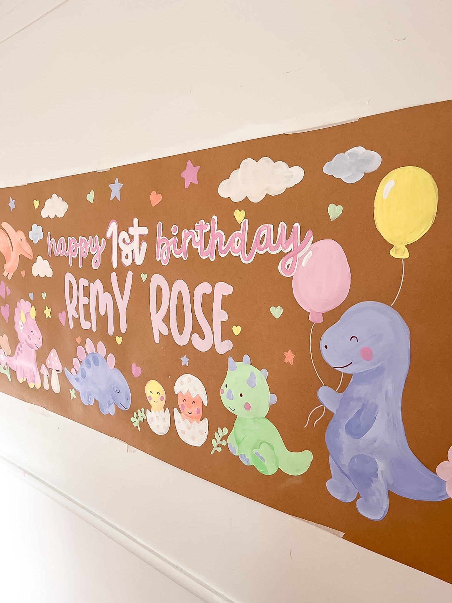 Each banner is painted with love in the Project Lane studio and made completely to order. The design can be personalised with your choice of name, event, and colour palette. Whether you’re celebrating a first birthday or planning a pastel-themed dino party, this banner is made to be the centrepiece of your decor — and a keepsake to treasure.