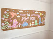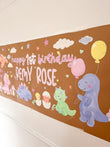 Bring a touch of handmade magic to your celebration with the Baby Dino Parade Birthday Banner. A custom, hand-painted acrylic design featuring soft pastel dinosaurs, floating balloons, and whimsical floral details.