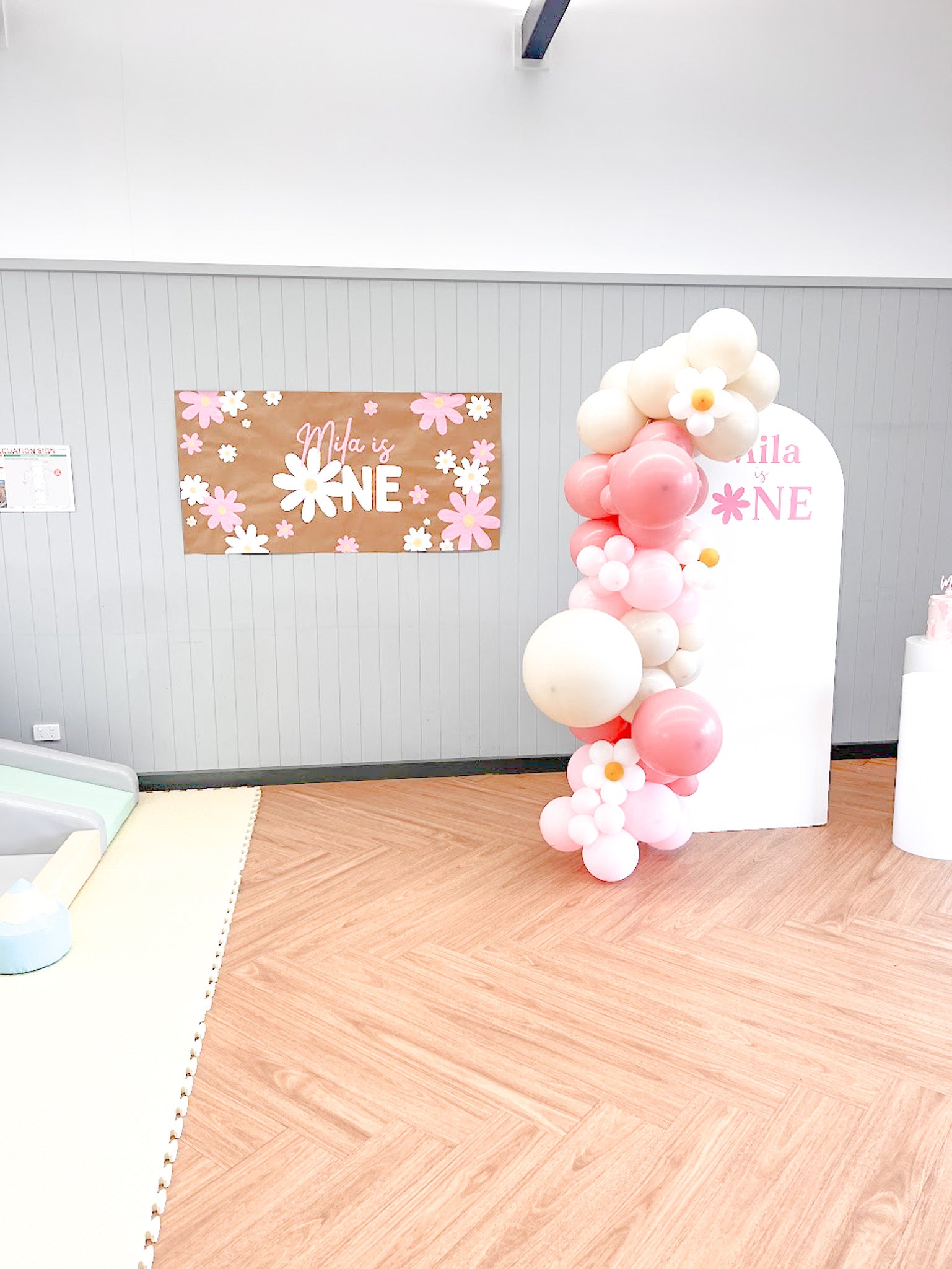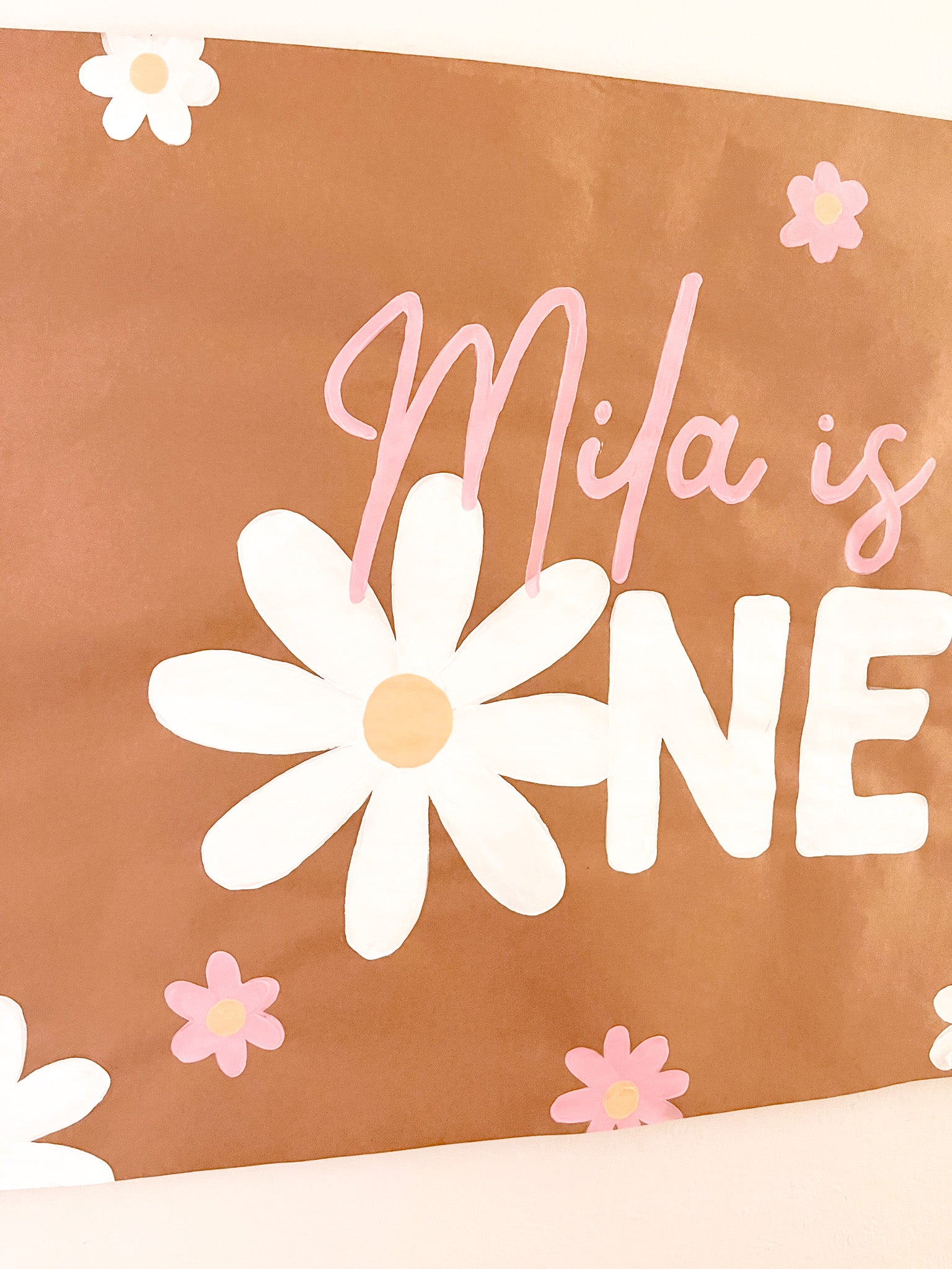 Each banner is hand-painted in the Project Lane studio using acrylics on kraft paper or fabric, with its signature pink and white daisies, warm lettering, and sweet feminine tones. The design can be personalised with your choice of name, event, and message — whether it’s a first birthday, birthday eve, baby shower, or milestone celebration.