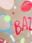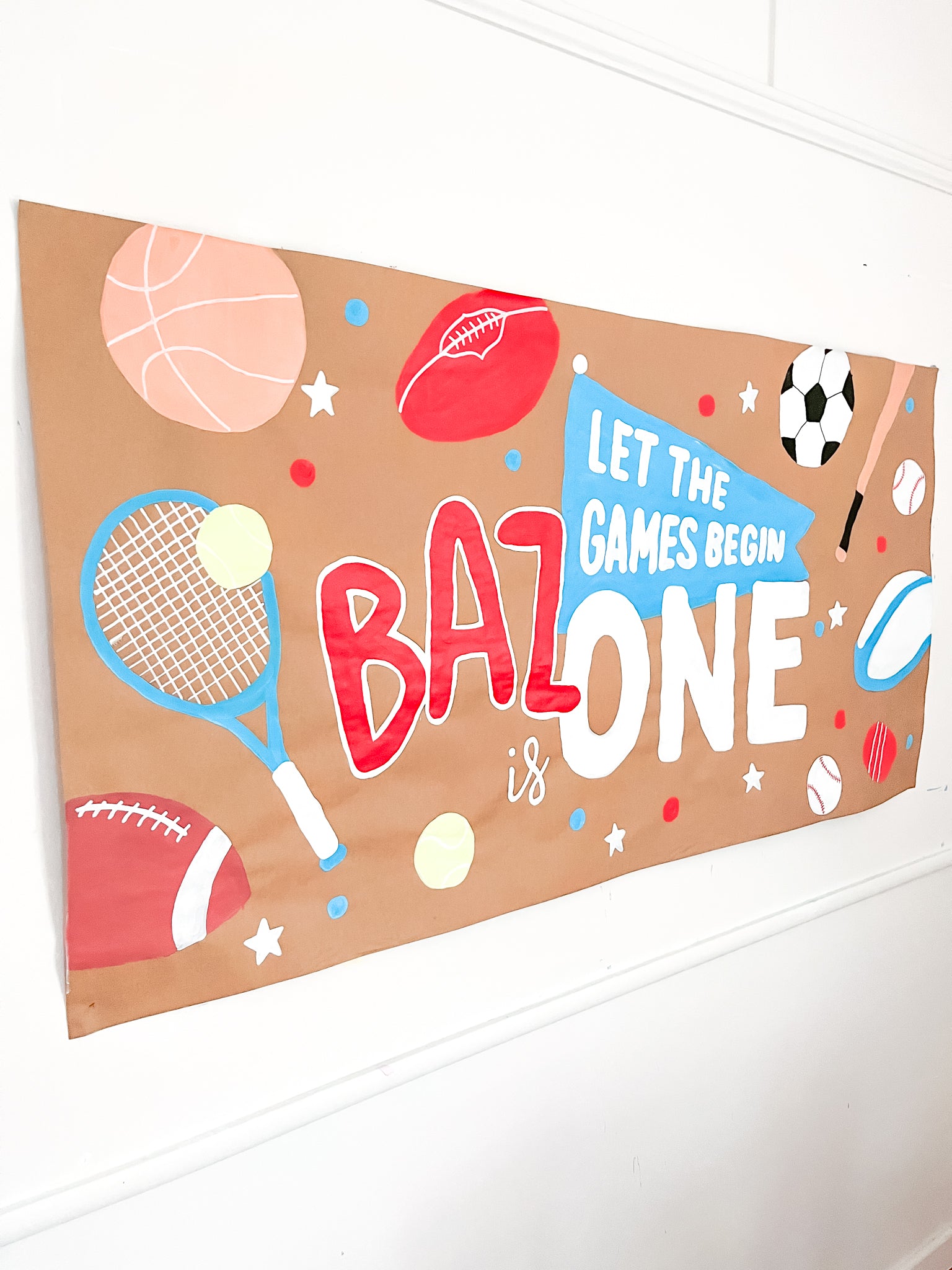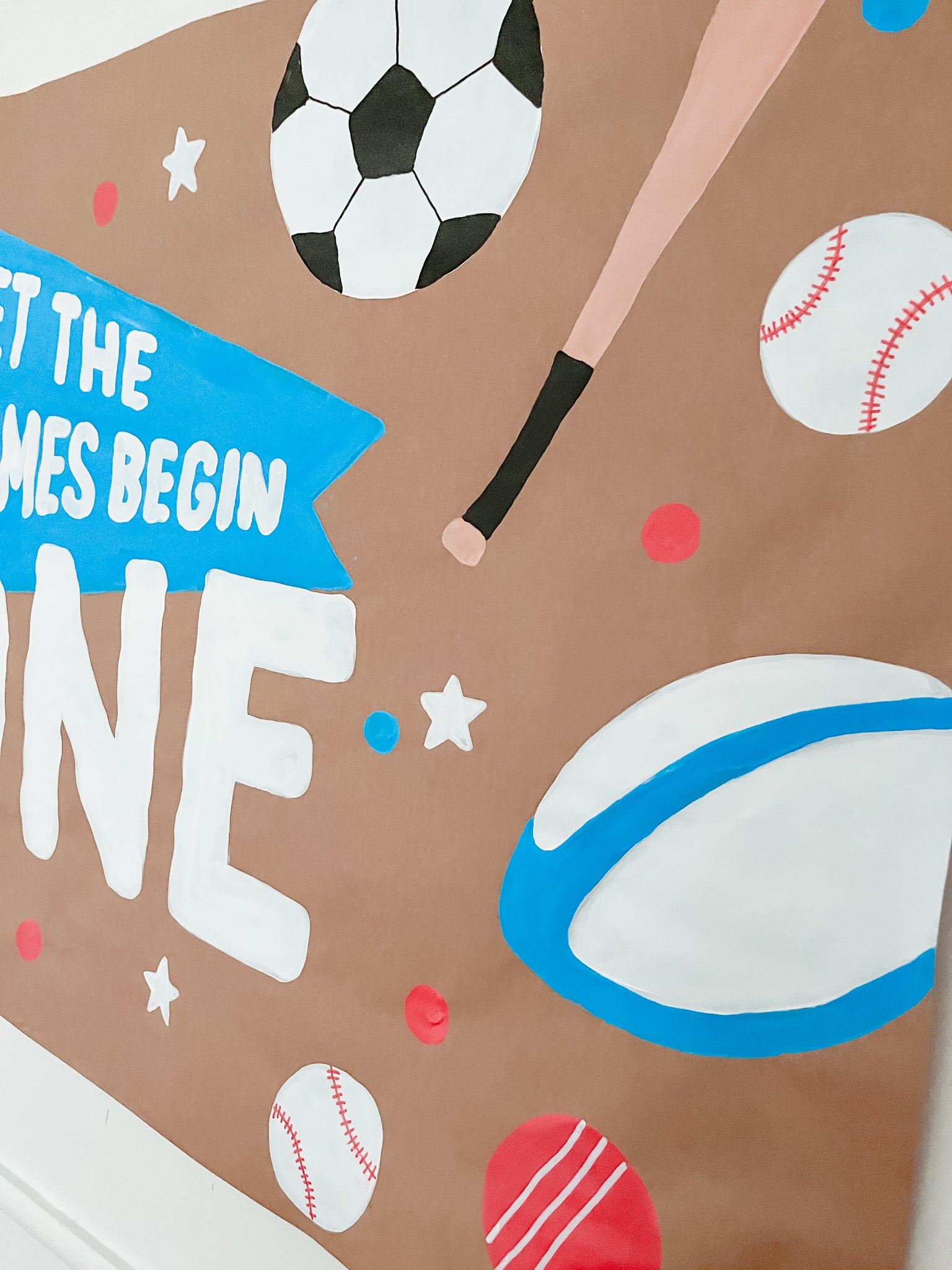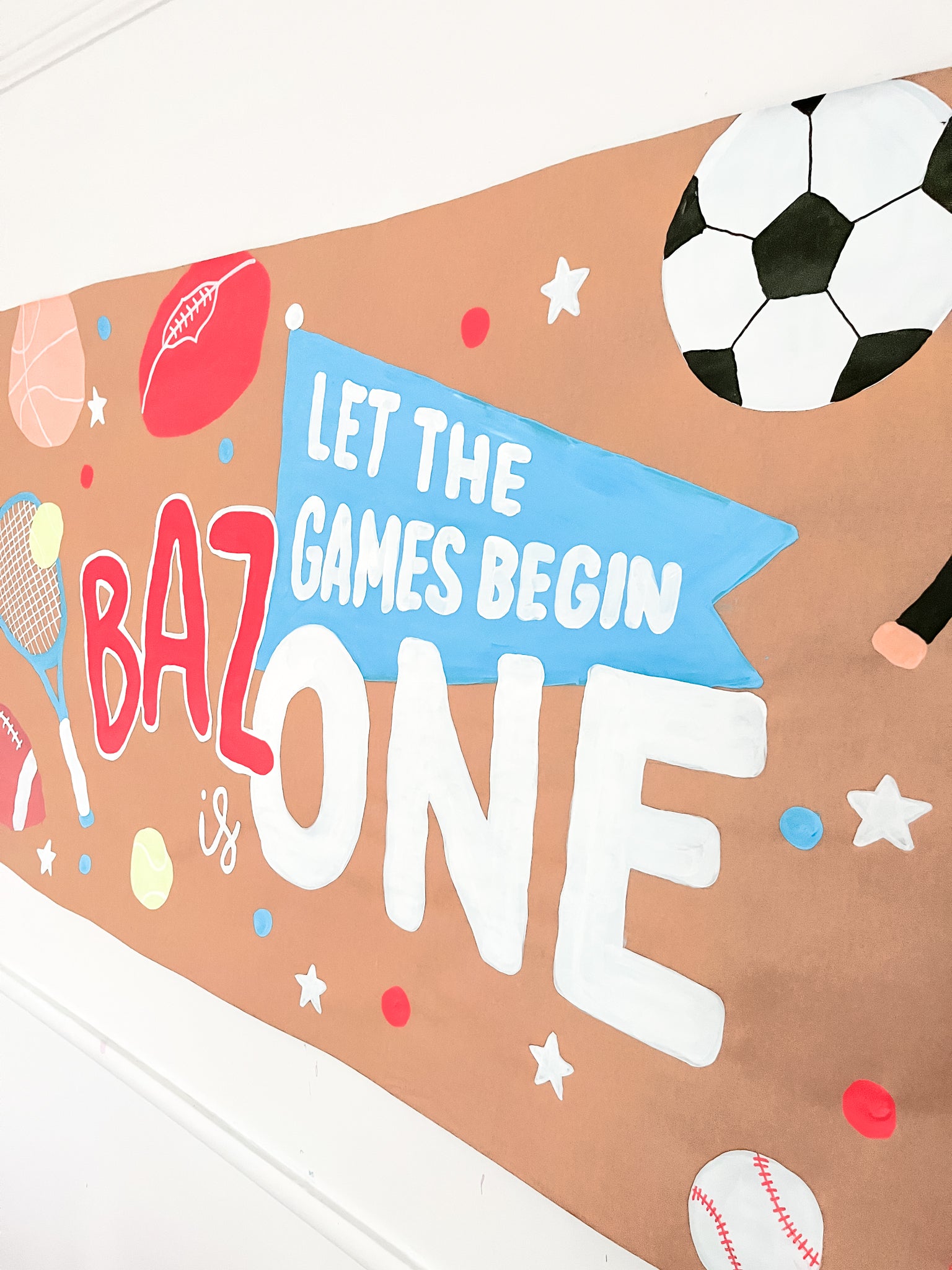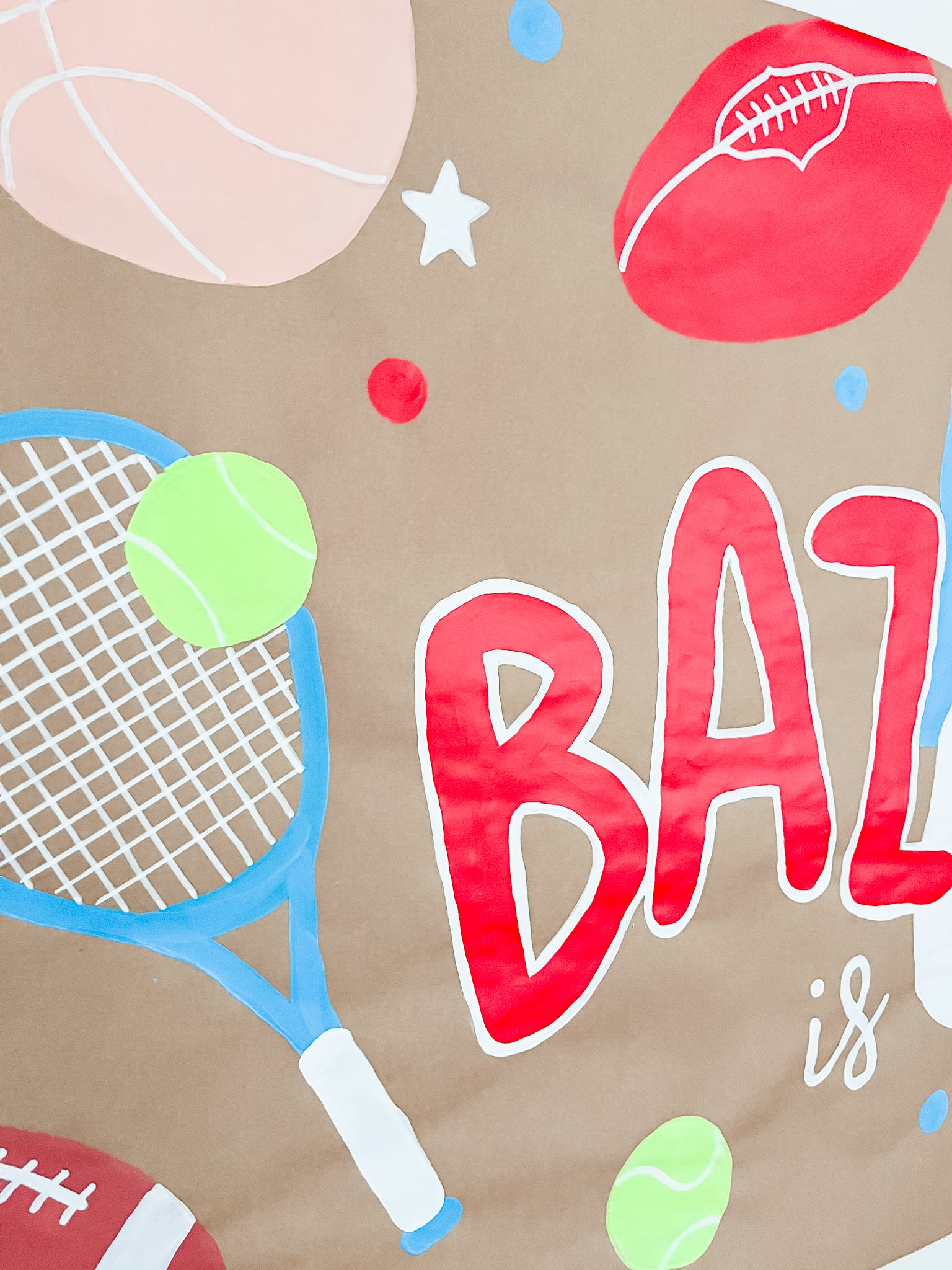 This hand-painted design captures the spirit of play and fun — perfect for birthdays, baby showers, and sports-themed parties. Painted in acrylic on kraft paper (or available on fabric upon request), this piece combines bold lettering and playful details for a cheerful, handmade finish.
