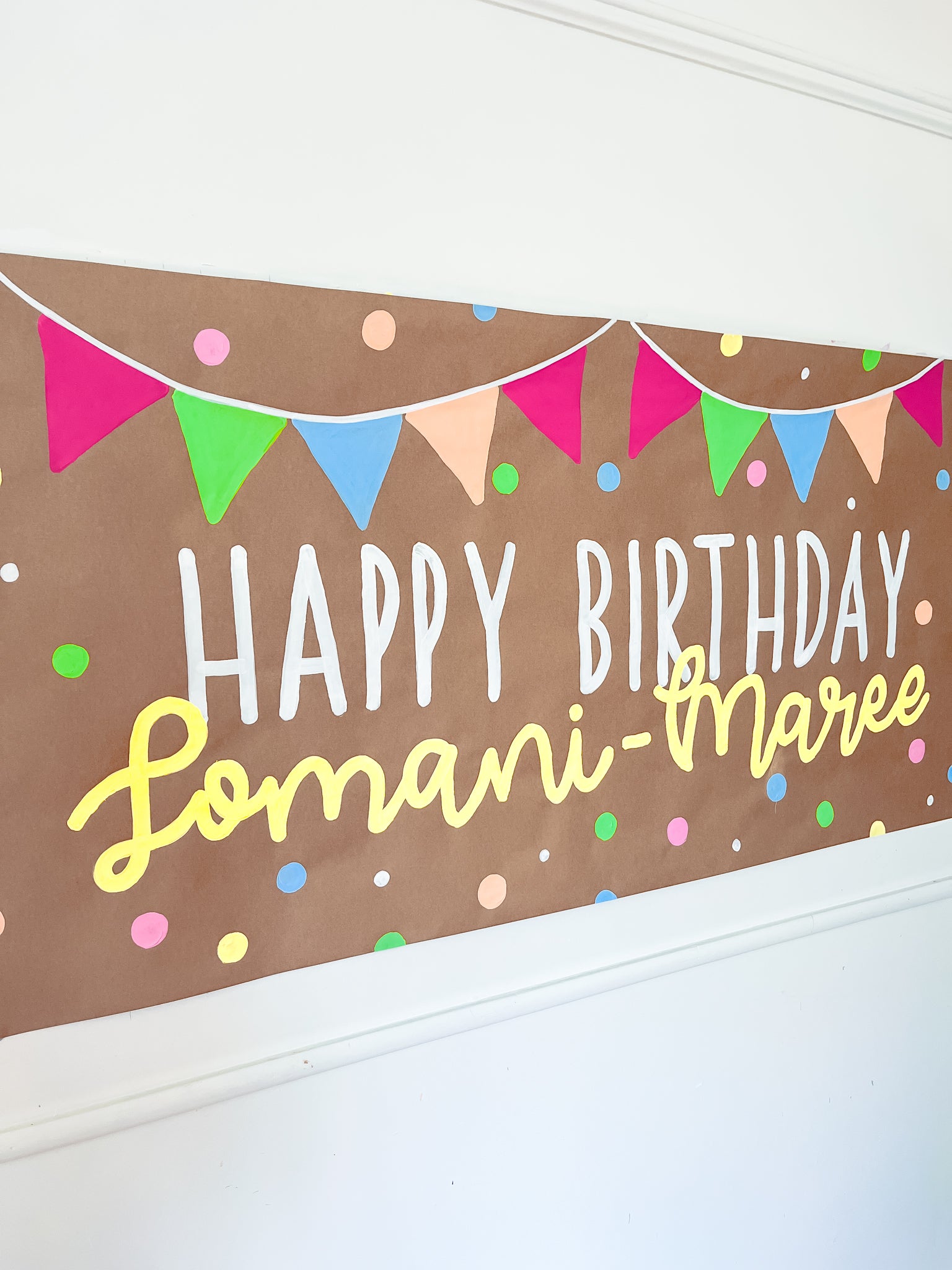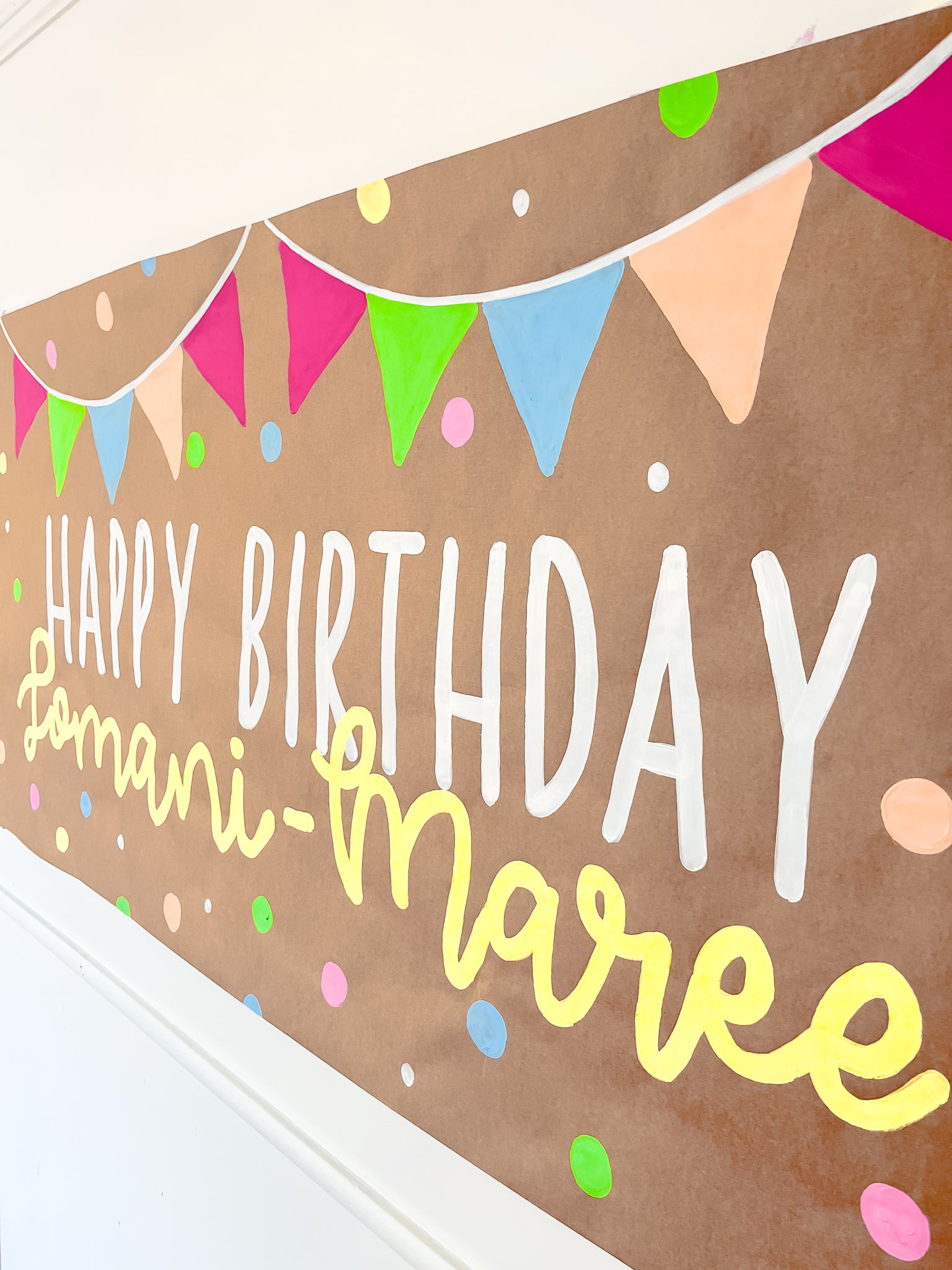Hand-painted with love on brown kraft paper, this Summer Brights banner is the perfect statement piece for birthdays of all ages. Featuring bold bunting in neon pink, lime, blue, and peach with scattered confetti dots, it adds instant colour and personality to your event.