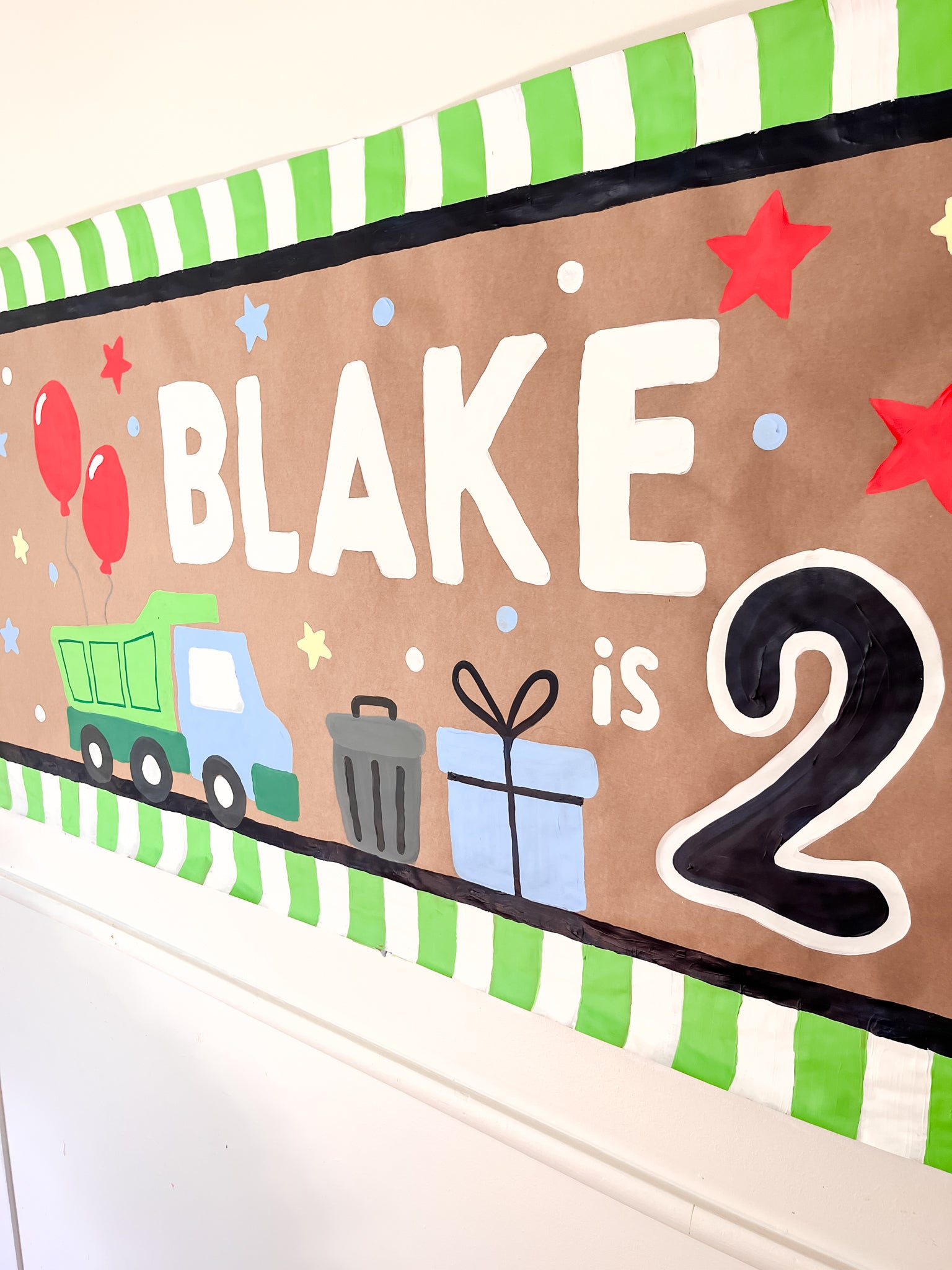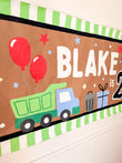 Each banner is hand-painted in the Project Lane studio using acrylics on kraft paper or fabric, featuring its signature green dump truck, red balloons, scattered stars, and bold white lettering. The design can be personalised with your child’s name, age, and message — perfect for a birthday, milestone celebration, or keepsake wall display.